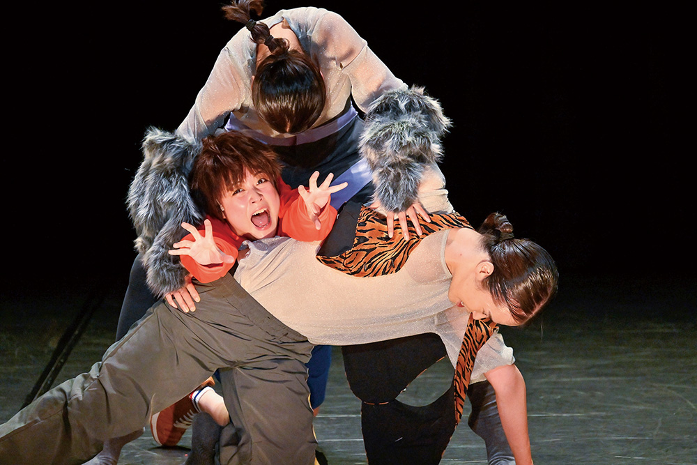 舞台版は、銭天堂の客たちの摩訶不思議な体験を、3話にわたるオムニバス形式で描くものでした。1話目は泳ぎが苦手な女の子、真由美が主人公の「型ぬき人魚グミ」。グミのおかげで泳げるようになる一方、危うく人魚になりかける展開はファンタジックでありつつ不条理な怖さも感じさせます。2話目は「猛獣ビスケット」。意地悪な男の子、信也が、盗んだ駄菓子のせいで猛獣に襲われる場面では、二人のダンサーが動物に扮し、ダイナミックな身体表現を披露しました。3話目の主人公は、「おもてなしティー」を使って架空の茶飲み友だちとの交流を楽しむ40代の女性、みどり。最後の一杯が運命の出会いにつながる物語には、大人のファンタジーの味わいがありました。