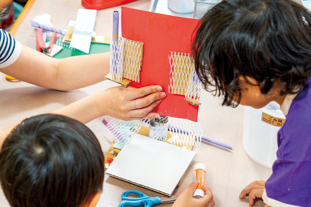 「ここは素材を体験する場でもあります。新しい紙だけでなく、廃材も切ったり組み合わせたりすることで思いがけない発見につながる。子どもがこちらの想像を超えてくるのが、面白いですね。『この素材をこんな風に使うの?』と驚くことも」と園田さん。