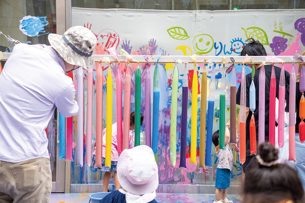 例えば絵の具コーナーの特徴は、赤・青・黄・白の4色だけが用意されていること。この4つの色を組み合わせることで、いろいろな色を生みだすことができます。子どもたちは、まずつくりたい色をイメージし、スタッフとコミュニケーションをとりながら、色を混ぜた時の変化を発見する楽しさに出会います。そうしてつくった色を使い、中庭(天候や気温により室内で実施する場合もあります)にある専用のお絵描きボードのほか、窓ガラスや床をキャンバスに、自由に絵を描いていきます。