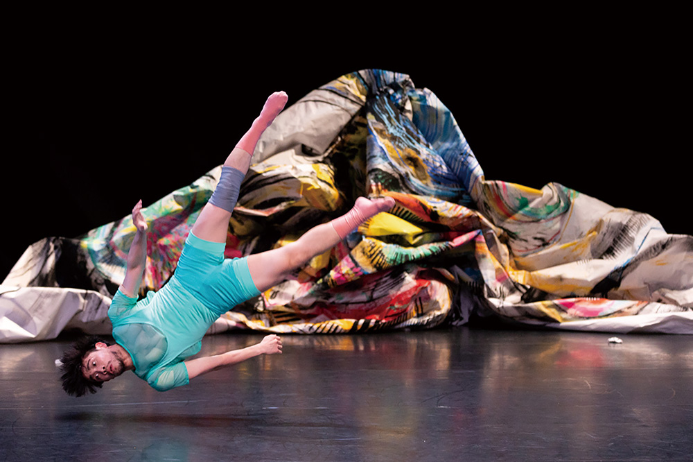和紙を用いた3部作の最終章。『EN』『TEN』での蓄積が12名の大掛かりな群舞に発展しました。包み、折り、広げ、自在に姿を変える紙と身体が響き合い、舞台上、時には客席上空にまでダイナミックな運動が広がります。行為の痕跡は墨の跡や皺として紙上に刻まれ、その音自体も音楽の一部に。人々の動きは社会活動の縮図のようでもあり、抽象性のなかに土の香りが漂います。終盤、白の大地が反転して色彩が一面に現れる瞬間は圧巻でした。