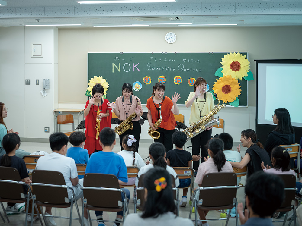 神奈川芸術文化財団の社会連携ポータル課が「鑑賞機会が少ない人たちに芸術を届けること」をテーマに企画した、社会教育との協働事業。2025年の夏、来日して間もない児童生徒が通う日本語支援拠点施設「ひまわり」(通称:ひまわり教室)で、サクソフォンカルテット「NOK Saxophone Quartet(ノック サクソフォン カルテット)」(以下、NOK)によるアウトリーチが行われました。